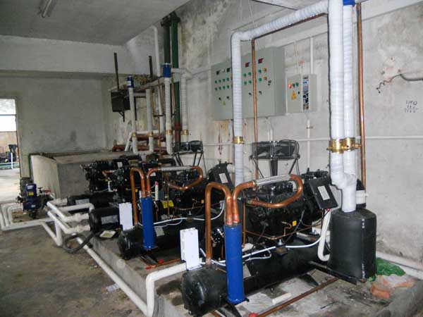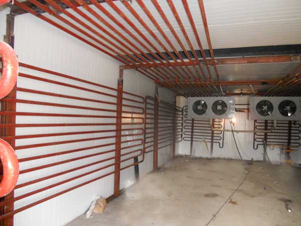 扩建速冻库:设计日速冻量为26吨,主机系统采用四套32匹Copeland水冷活塞低温机组,蒸发器采用4台115平方低温型电融霜冷风机和2台170平方低温型水冲霜冷风机,并采用了高效双翅铝排管,以同时满足非加工高峰期的玉米冷藏功能。
