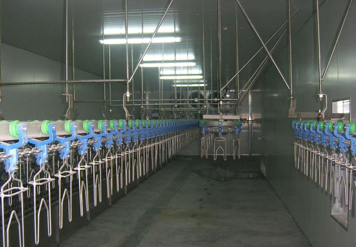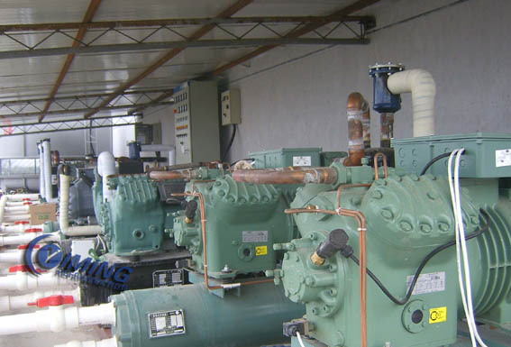本工程分为-45℃冷库、冷水池、冷藏库、冷却间、操作间、内脏处理间、冷却塔。配有冷凝机组8套15匹以上的比泽尔水冷冷凝机组、6套DD系列、DL系列风冷蒸发器。库板选用100mm、150mm聚氨酯双面彩钢板配合使用,-45℃冷库采用盘管制冷,机组为6缸25匹双级水冷机组。另外几间为25匹、15匹、30匹冷凝机组,蒸发式风冷冷凝,制冷剂均为美国R404。